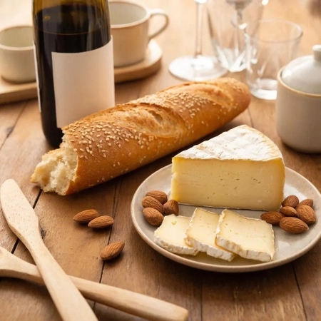 Разложите нарезанный багет рядом с сыром на тарелочке. Подавайте сразу после приготовления, пока сыр ещё мягкий и аппетитный!